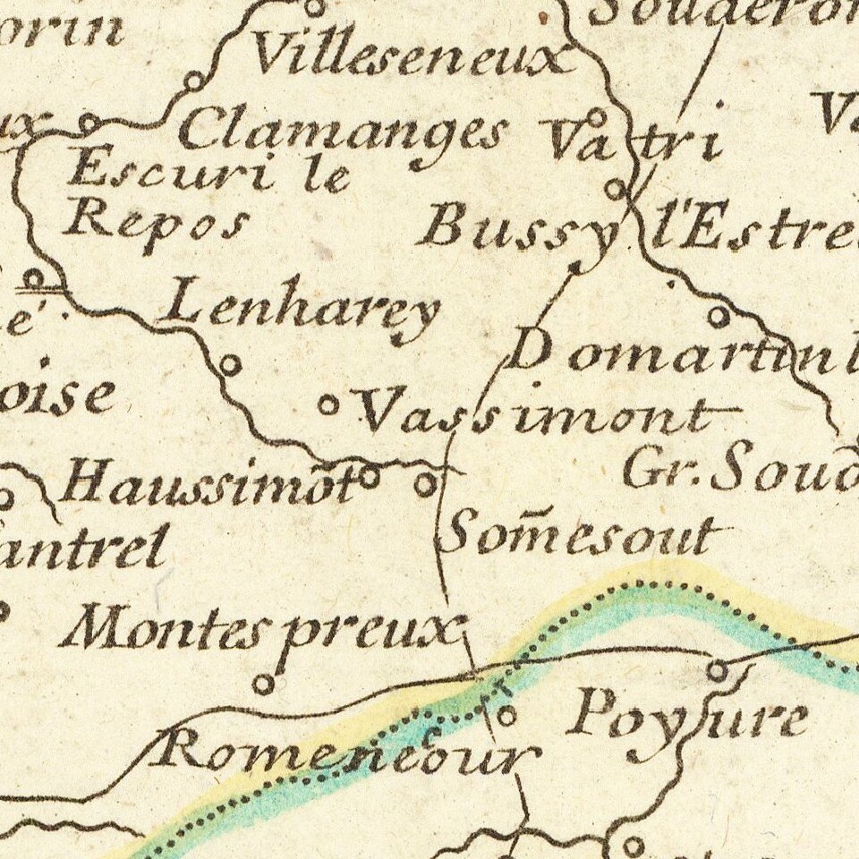 Extends south to Dijon, Semeur and Cosne, west to Melun, Lagny and Mondidier, north to Bavay and Chuyn and east to Arlon, Hatton Chastel, and Aigremont. Also shows Auxerre, Troyes, Rheims, Soissons, Chaalons, Laon and La Capelle.
