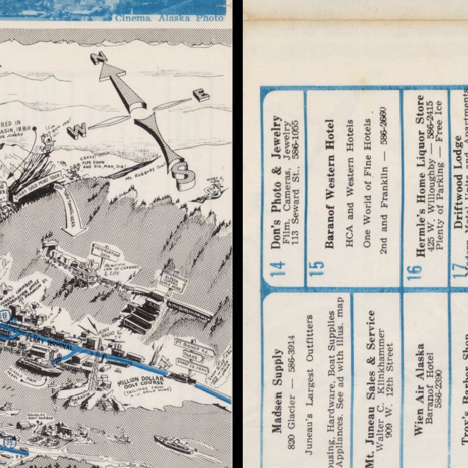 Decorative and detailed view of Juneau Alaska by Alaskan Artist Rudy J. Ripley, with a map of Juneau, local advertising and promotional information.