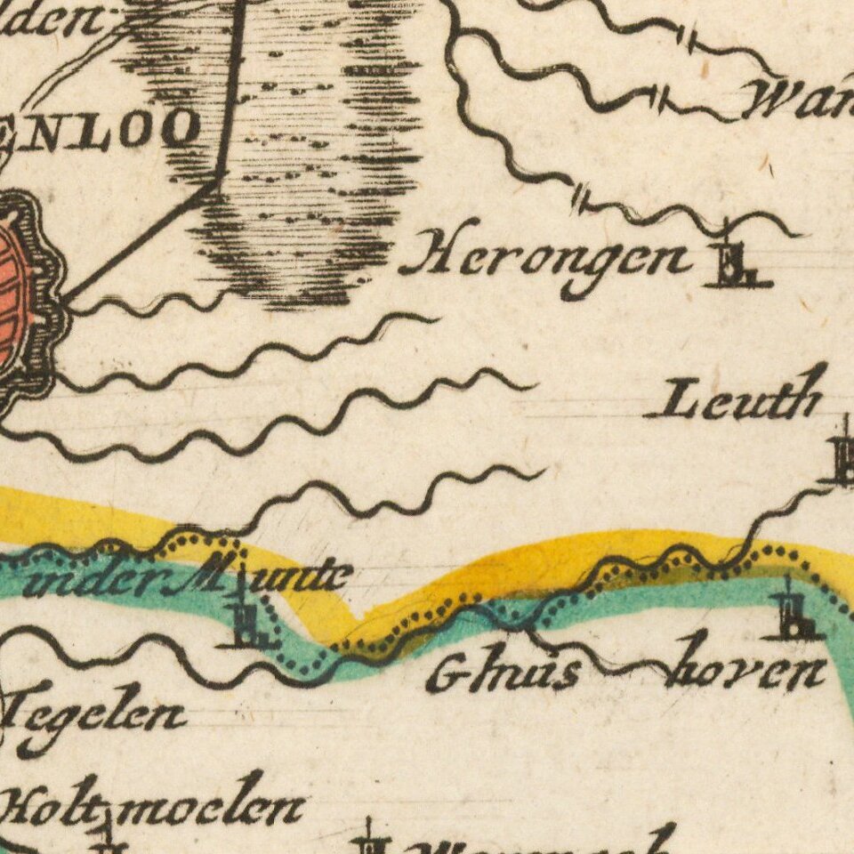Attractive engraving of Gelderland with the towns of Roermond and Venlo at center. The map is filled with tiny villages, towns, lakes and rivers. Adorned by a decorative strapwork title cartouche and five distance scales.