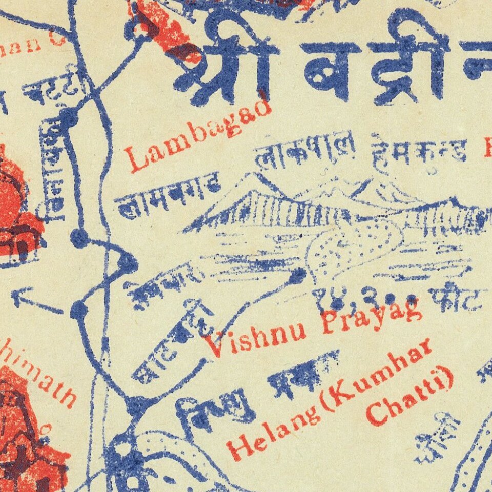 The map illustrates the region to the north and east of the city Haridwar, part of the Uttarakhand region of India. The Uttarakhand region is considered “the playground of the Gods” (Sastry 1981, p. 43) for the beauty of the Himalayan region and the existence of numerous holy sites. The area around Badrinath in particular was celebrated in Padma Purana as abounding in spiritual treasures. The city of Haridwar, located in the bottom left corner, is considered one of the seven holy cities in Hinduism.