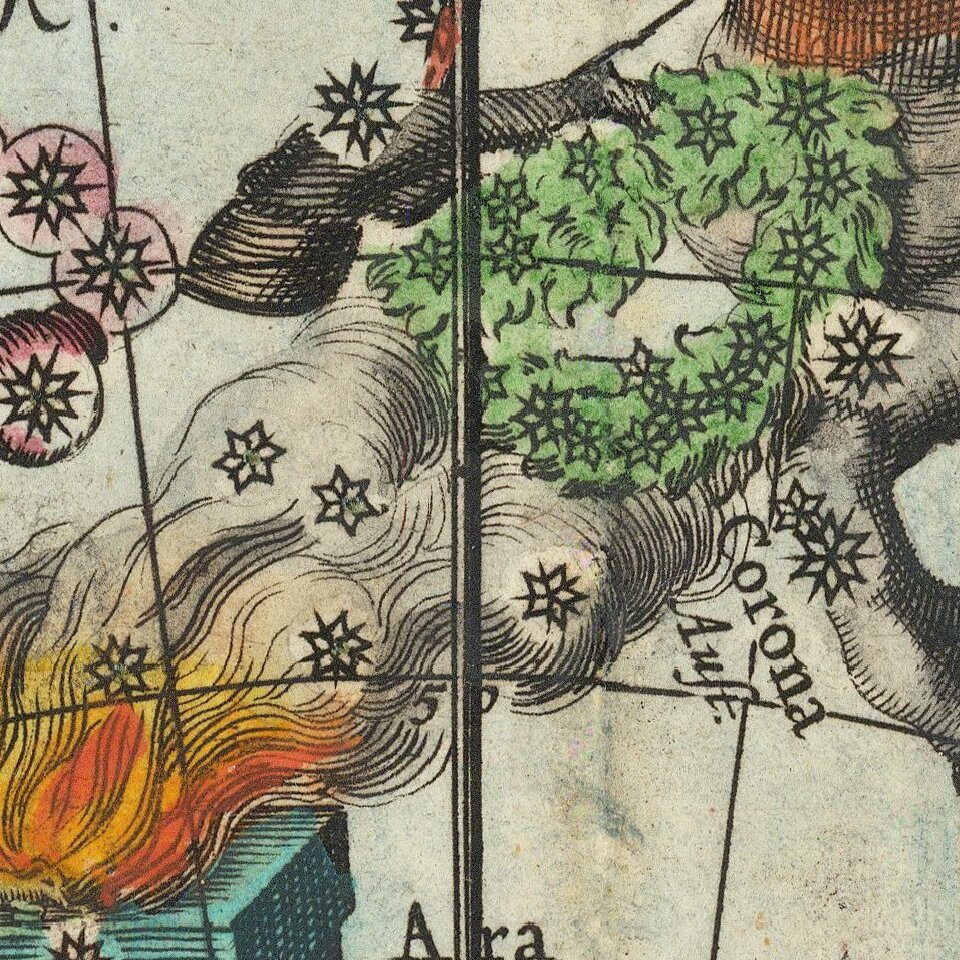 The map provides a fantastic image of the stars, as if seen from deeper in space, so that each of the constellations is facing in the opposite direction from the way that the same constellations would be seen from earth. This projection reflects a theory that originated with Petrus Plancius that the stars remained in a sphere-like configuration above the earth and moved in coordination with the earth. This theory is reflected in the title of Celarius's atlas, Harmonia Macrocosmica.