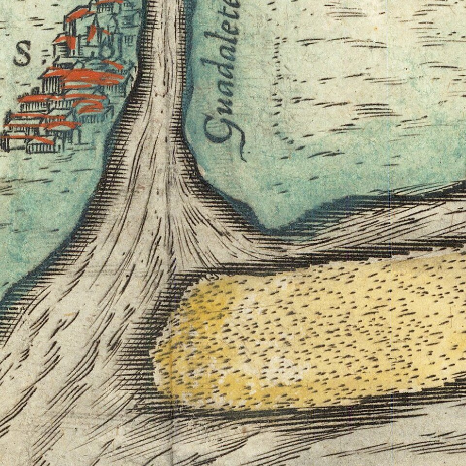 Two smaller maps depict the Tagus River from Toledo extending North and East to Morata, Cinchon and Colmenar, and a second inset of the region bounded by San Sebastian and Deva. 4 decorative cartouches and spectacular ornamental strapwork around the map of the Bay of Cadiz.