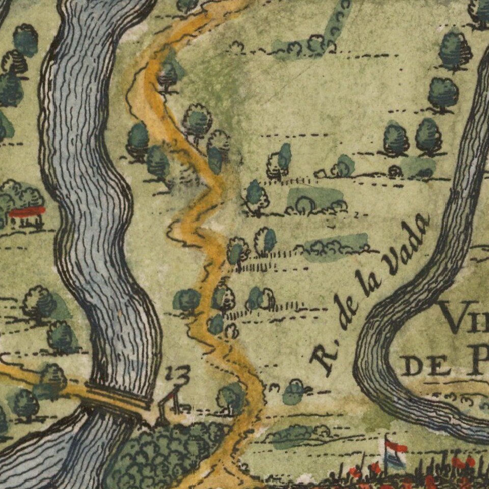 The map depicts a naval battle activities of February 1630, illustrating the Dutch attack of the Portuguese held town of Olinda. To the left, the Dutch ships engage the Portuguese fortifications at the mouth of the River, while to the right of Olinda, a large landing force of foot soldiers disembarks and proceeds toward the poorly protected town of Olinda.