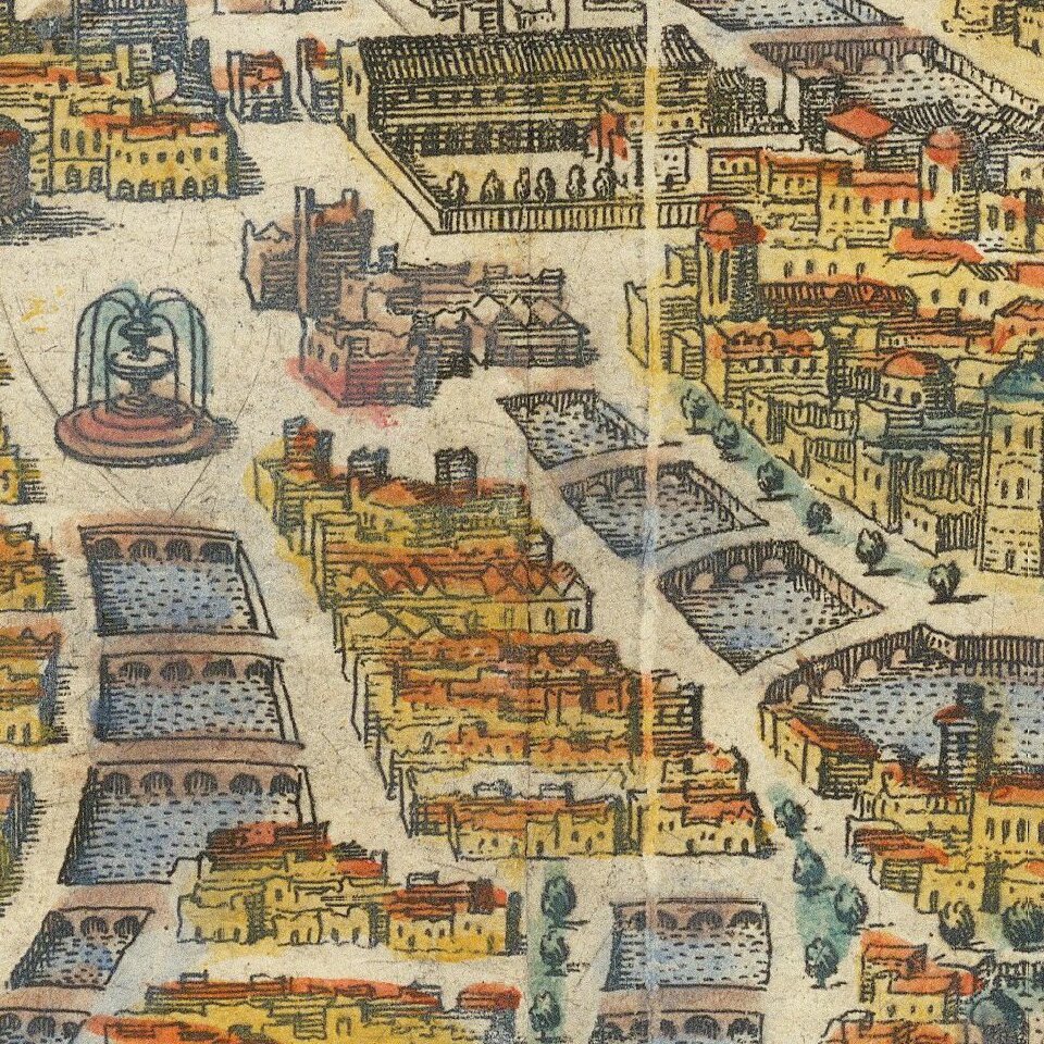 Mathaus Merian (1593-1650) was the father of engraver Matthäus the Younger, and of the painter, engraver, and naturalist Maria Sibylla Merian. He was born in Basel, Switzerland and trained in engraving in Zurich. After a time in Nancy, Paris and Strasbourg, he settled in Frankfurt. While there, he worked for Johann Theodor de Bry, the publisher and son of the travel writer. In 1617, he married Maria Magdalena de Bry, Johann Theodor’s daughter. In 1623, Merian took over the de Bry publishing house upon the death of his father-in-law. Merian’s best known works are detailed town views which, due to their accuracy and artistry, form a valuable record of European urban life in the first half of the sixteenth century
