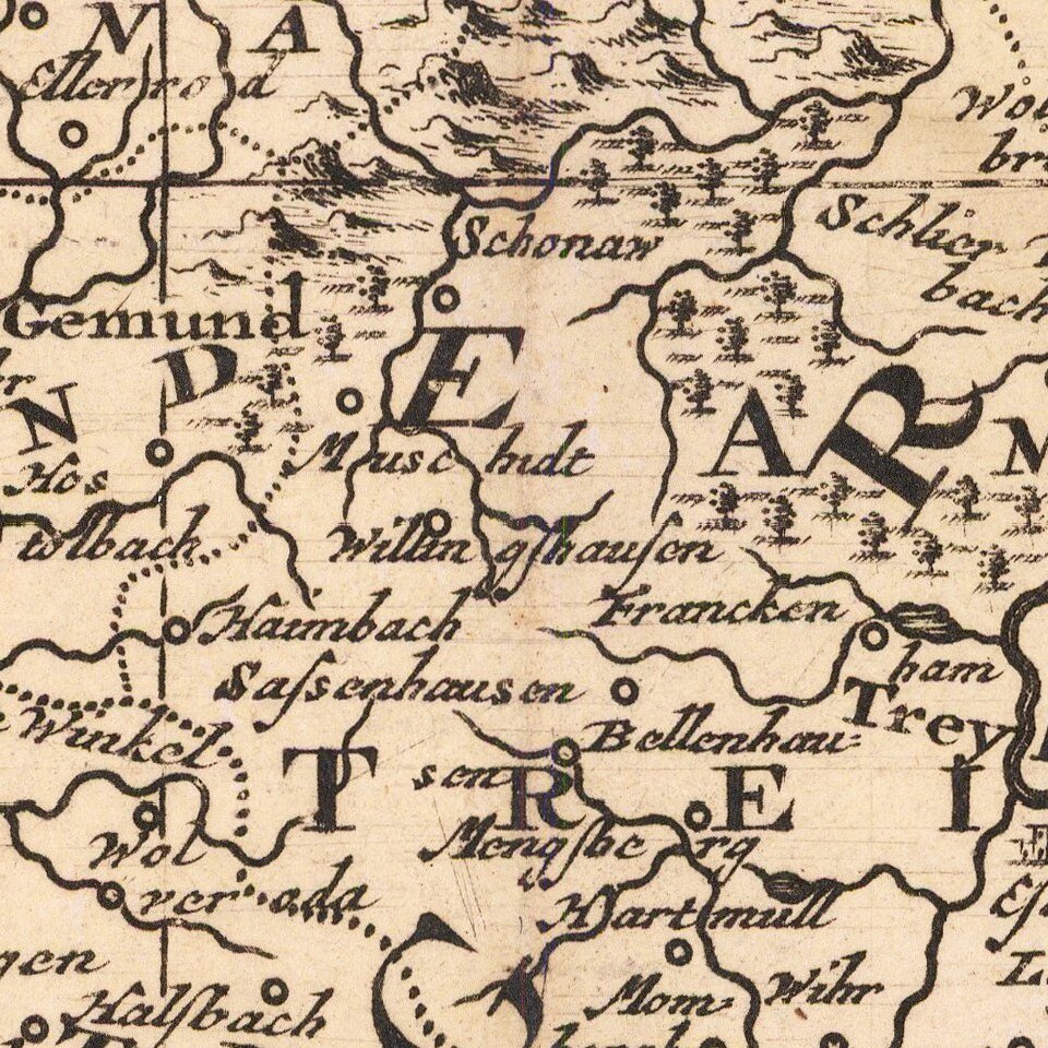 The map follows the course of the Upper Rhine River and the Upper Wesser.