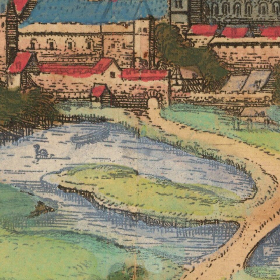 Georg Braun (1541-1622) was born and died in Cologne. His primary vocation was as Catholic cleric; he spent thirty-seven years as canon and dean at the church St. Maria ad Gradus, in Cologne. Braun was the chief editor of the Civitates orbis terrarum, the greatest book of town views ever published. His job entailed hiring artists, acquiring source material for the maps and views, and writing the text. In this role, he was assisted by Abraham Ortelius. Braun lived into his 80s, and he was the only member of the original team to witness the publication of the sixth volume in 1617.