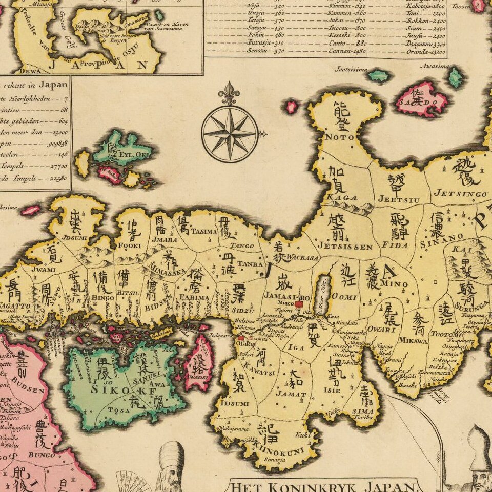 The map was prepared by Johann Caspar Scheuchzer from the maps brought back from Japan by Kaempfer. The decorative features are drawn directly from Kaempfer's manuscript including a Japanese compass and three gods of fortune The map was a dramatically different map than any of its predecessors, providing a north oriented Tohoku and overall squat shape. Japan is divided into 68 provinces, each with its Japanese name included in Japanese characters.