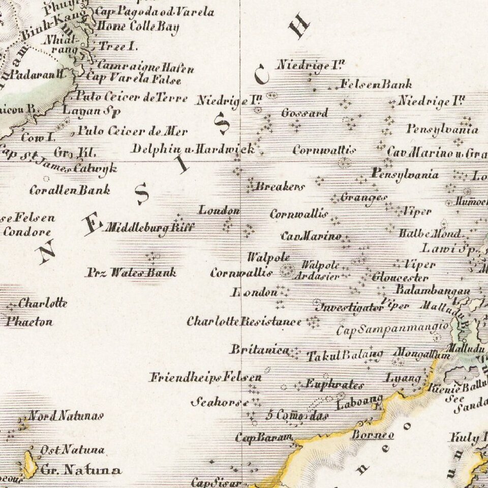 Scarce and highly detailed map of Southeast Asia, including southern China, the Philippines, the Malaysian Peninsula and extending south to Java, Timor and the northern tip of Australia.