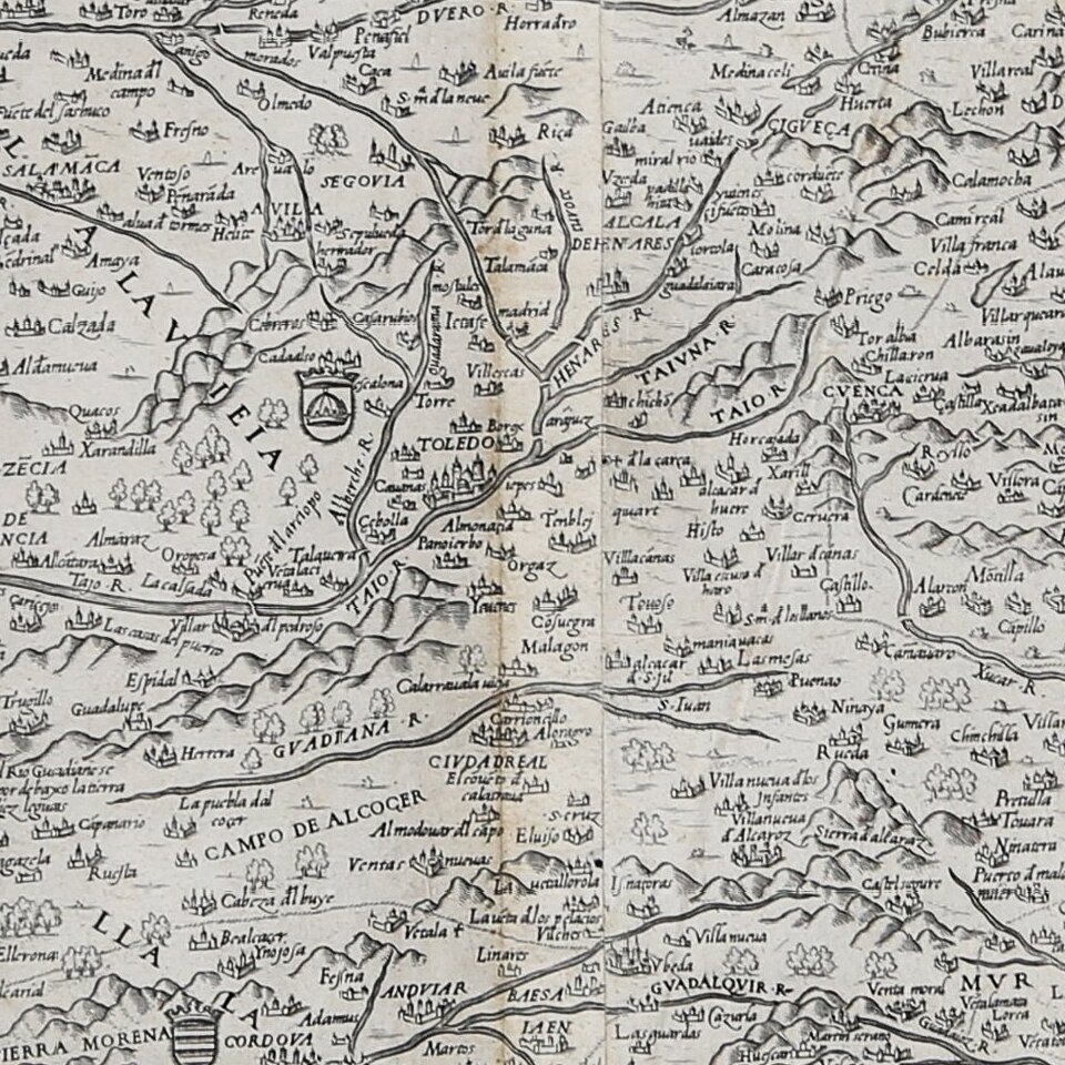 The copper plate was certainly in possession of Claudio Duchetti (probably through Lafreri in whose catalog a map of Spain is listed) and subsequently inherited by Giacomo Gherardi. The work, in fact, is included in the catalog drawn up on behalf of the widow Quintilia Lucidi (17-19 October 1598, n ° 418) where it is described as "doi fogli reali della spagna reale".
