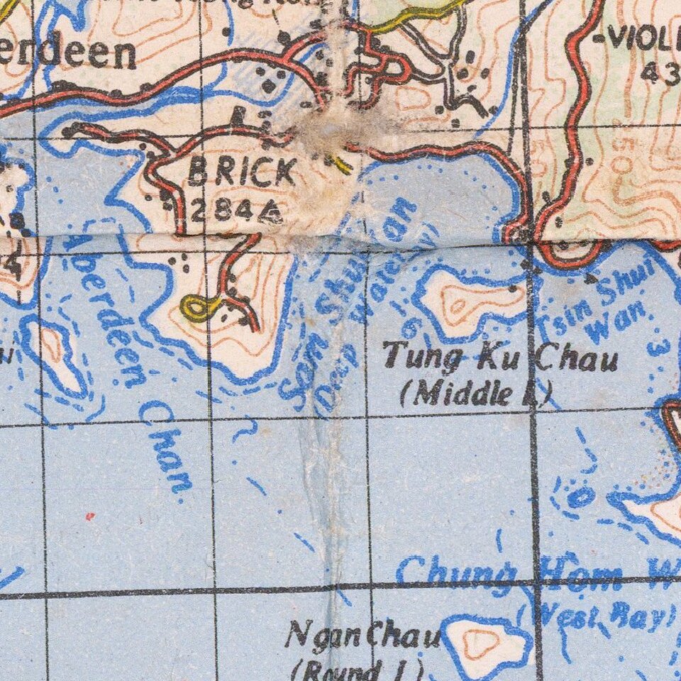 Detailed British military mapping of Hong Kong, published in two sheets (here joined as one), in 1958.
