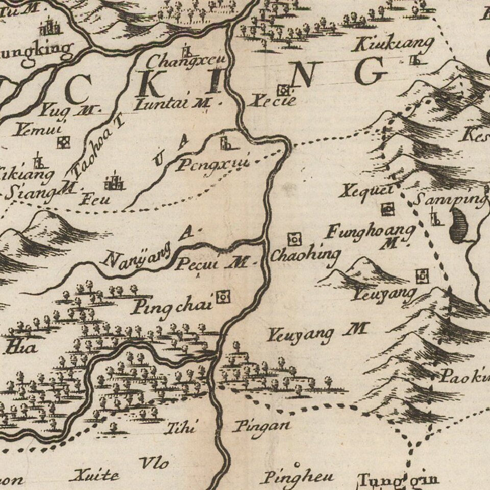 Decorative and highly detailed regional map of China, including parts of the Szechwan and Hunan Provinces.
