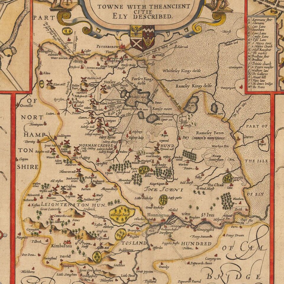 A nice example of this decorative County map of Huntingtonshire by John Speed.