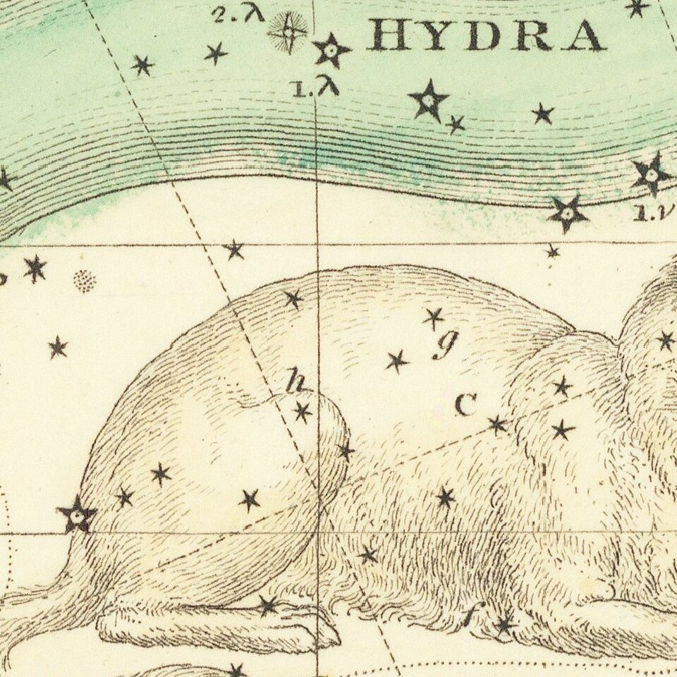Hydra is the largest modern constellation and was is described as far back as Ptolomy. In Greek myth, it represents either the snake sent to kill Apollo (in the cup represented by Crater) or the many-headed Hydra which Hercules slew.
