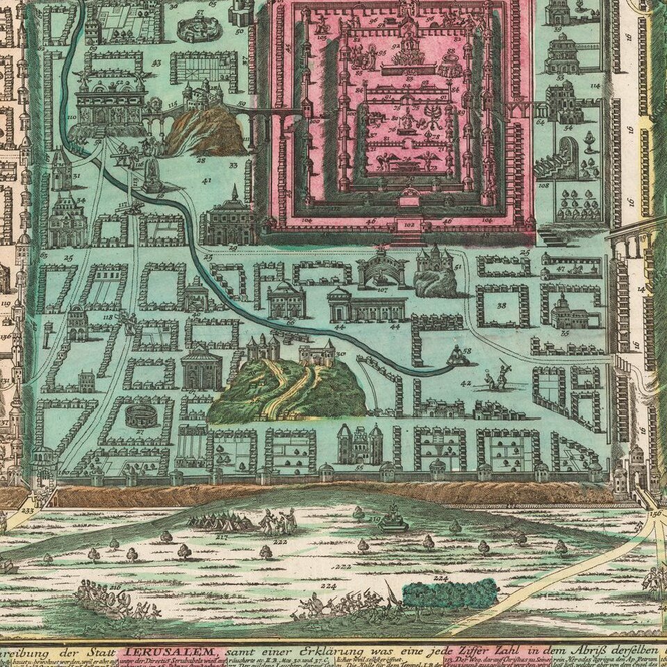 Van Adrichom's plan was later copied by Jodocus Henricus Kramer in the late 17th century and also forms the basis for Braun & Hogenberg's 2 sheet vertical plan of Ancient Jerusalem (c 1588) and by Jan Jansson in his 1657 town book. Moreover, Adrichom's influence can be seen in many of the plans of Jerusalem published in the 17th and 18th centuries.