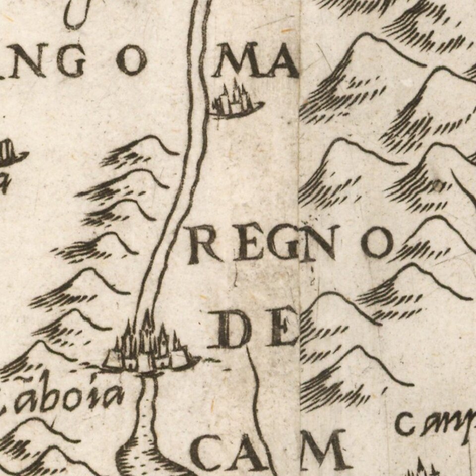 Gastaldi's map of Southeast Asia has a remarkable history, one that presents a microcosm of Italian mapmaking in the middle of the 16th Century. The map begins with the publication of a single section in 1559, which was intended as a separate map. Additional sections were added in 1561, creating the portion of the existing map which extends south to the Equator. In 1565, two additional sections were added, in order to show all of Indonesia and neighboring islands as far south as Java Minor.