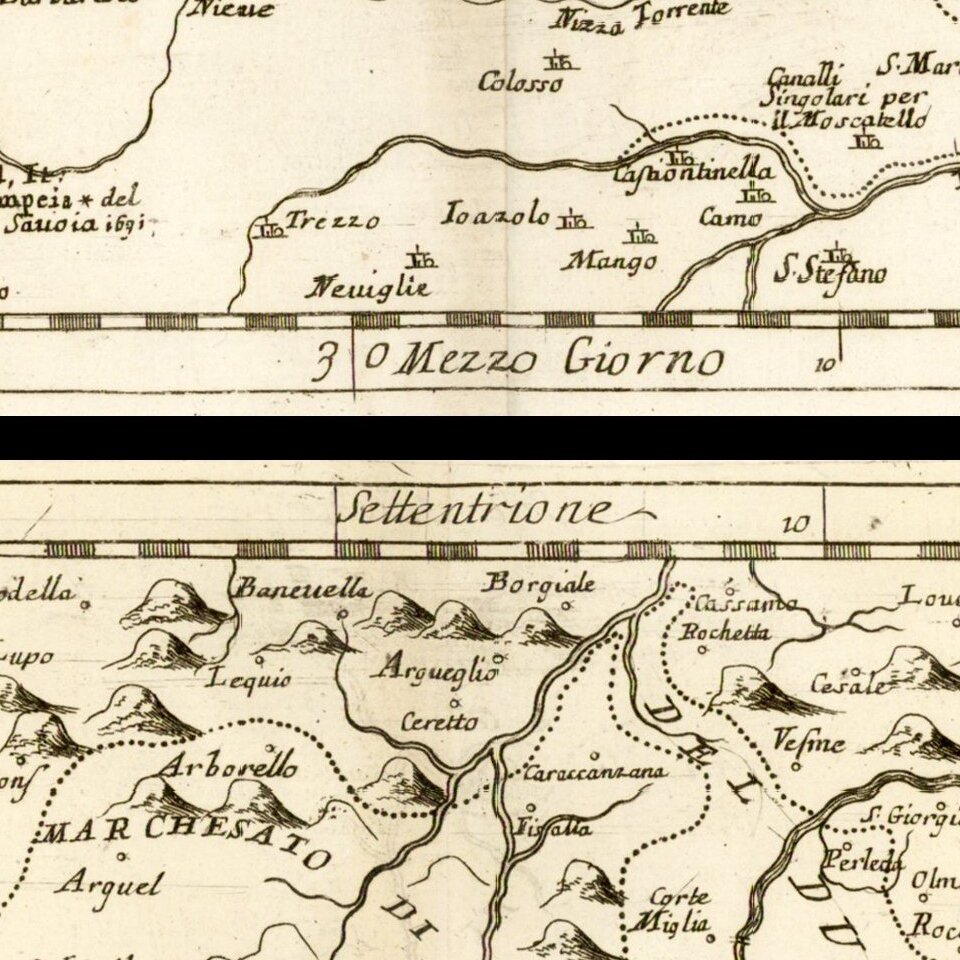 The map provides a fantastic image of the topography of the region, naming mountains, rivers, lakes, towns, castles, etc. Includes an elegant cartouche and numerous coats of arms. Includes the cities of Turin, Casale, Allesandria, Ovada and many others. It is without question the most beautiful and detailed maps of the region to appear in a commercial atlas at the end of the 17th century.