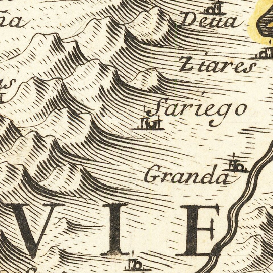 Divided into Asturia di Oviedo and Asturia di Santaillana, the map illustrates an exceptional topographical style which characterizes the work of Rossi in this period.