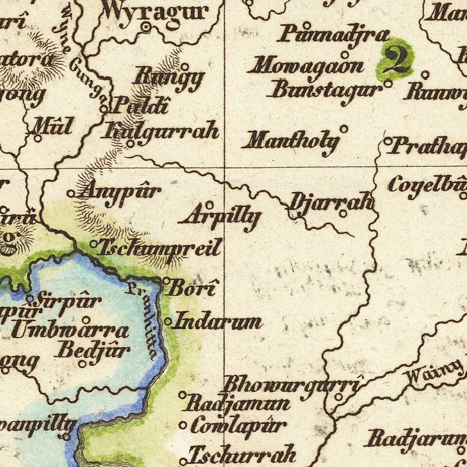 Derived from the maps of James Rennell with significant additioins, the map is exceptionally detailed, one of the best compilations of information for India published in the period.