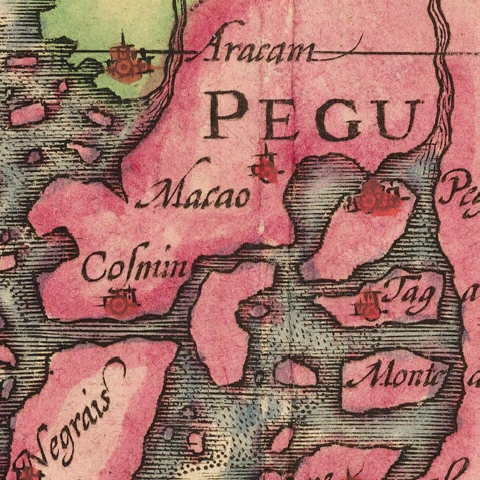 One of the finest early Dutch maps of the region, first published in 1606 as one of the 37 new maps engraved for Jodocus Hondius' expanded Dutch edition of the Mercator Atlas. Extending from India to the coasts of Southern China with the Pearl River Estuary, Canton and Formosa, it also includes all of the Malay peninsula and Indochina, northern Borneo and the Philippines.