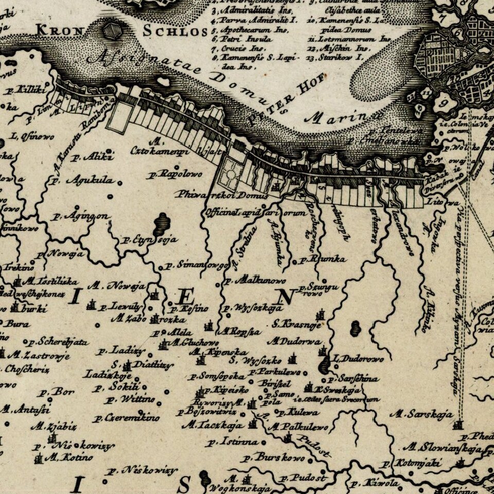 Highly detailed regional map of Russia, showing the area around St. Petersburg. Includes a large birdseye view of the harbor and two decorative cartouches.