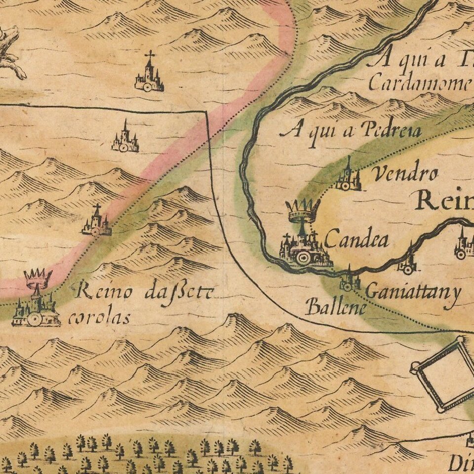Hondius moved to London in 1584, fleeing religious persecution in Flanders. There, he worked for Richard Hakluyt and Edward Wright, among others. Hondius also engraved the globe gores for Emery Molyneux’s pair of globes in 1592; Wright plotted the coastlines. His engraving and nautical painting skills introduced him to an elite group of geographic knowledge seekers and producers, including the navigators Drake, Thomas Cavendish, and Walter Raleigh, as well as engravers like Theodor De Bry and Augustine Ryther. This network gave Hondius access to manuscript charts and descriptions which he then translated into engraved maps.