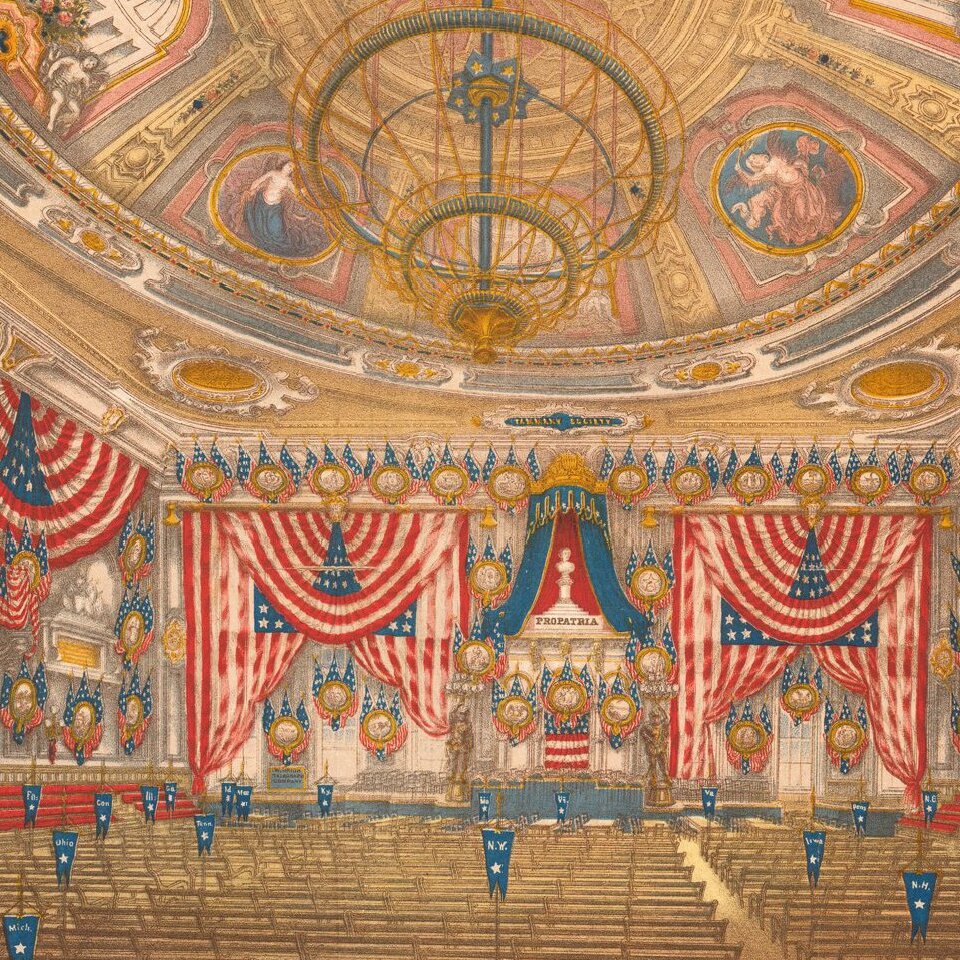 Color-lithographed view of the interior of Tammany Hall, the site of the 1868 Democratic National Convention, widely considered to be the worst mainstream party convention in American history.