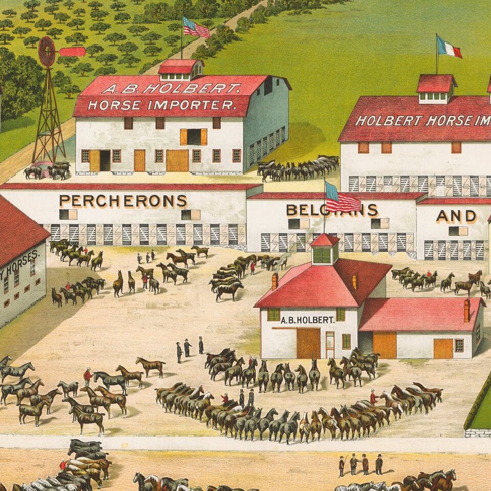 In 1878, Holbert Horse Importing Company was established in the Delaware County town of Greeley and quickly garnered an international reputation for horse selling and breeding. Founder A.B. Holbert had an international reputation and was considered "the most extensive importer, breeder and seller of registered horses in the United States" ( History of Delaware County, Iowa, Chicago: S.J. Clarke Company, 1914).