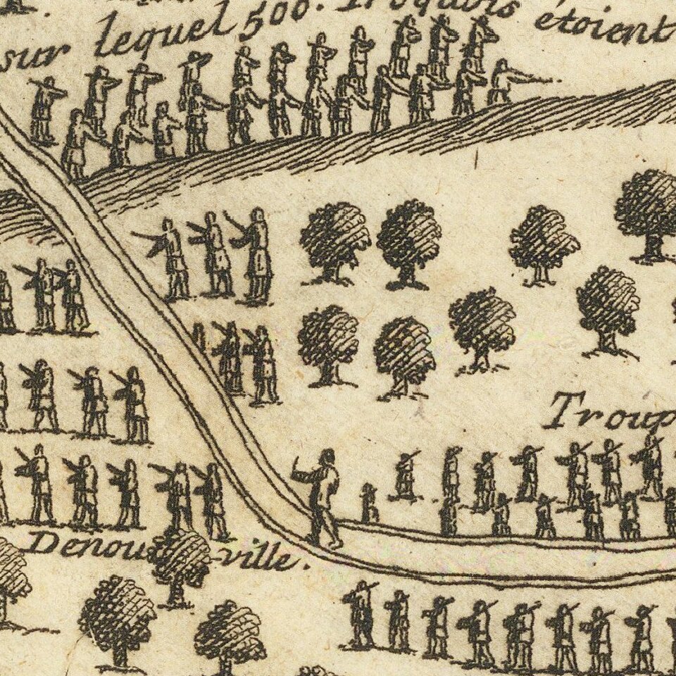 Upon a hill, toward the top of the engraving, are Iriquois warriors awaiting French soldiers. They are laying an ambush, according the notes included. They are facing off against regular French troops, local militia, and tribes friendly to the French.