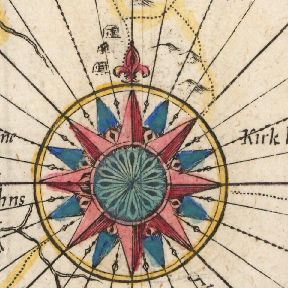 Very decorative compass rose in the center of the island with rhumb lines radiating outward and lovely scroll lettering in sea.