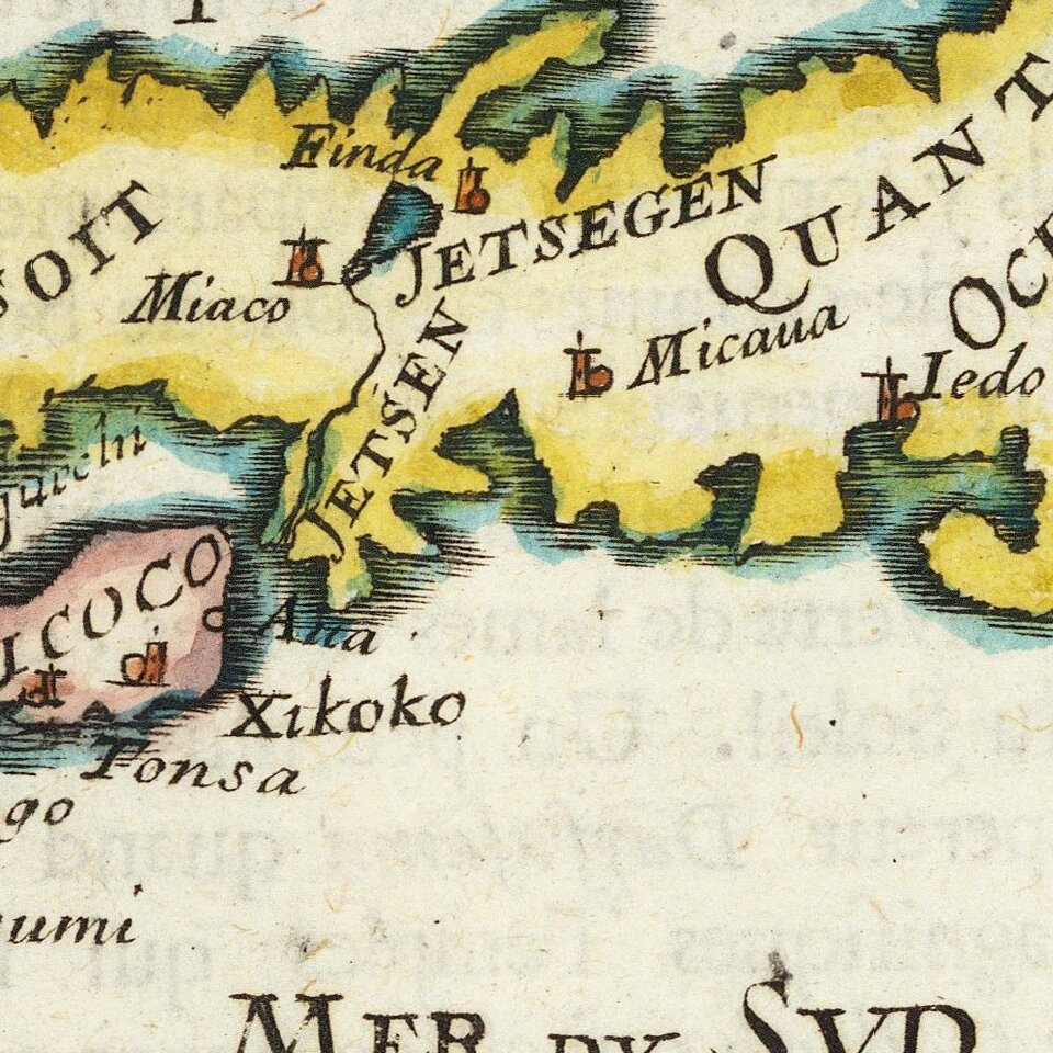 Decorative miniature map of Japan, from the first edition of Mallet's monumental work.