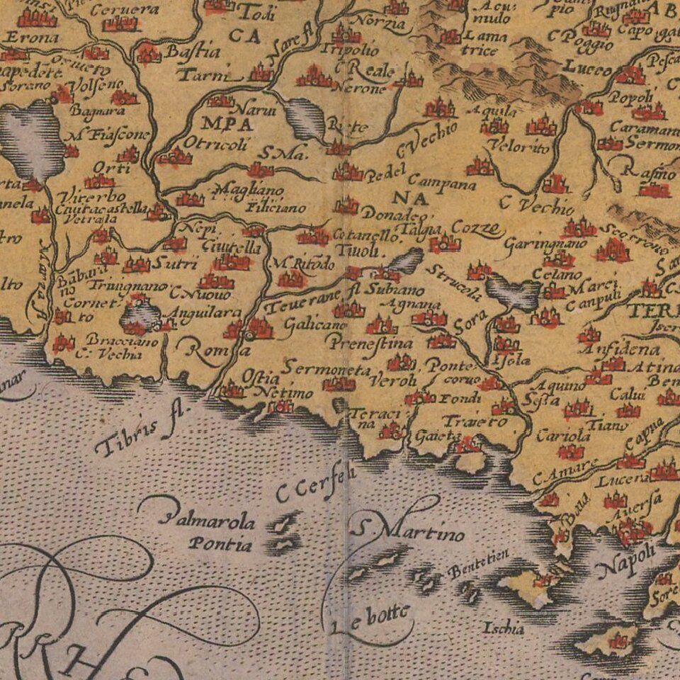 In 1584, Ortelius revised his map of Italy. The changes are primarily aesthetic, with more elaborate script lettering in the Adriatic and Mediterranean and a less scandalous example of Neptune and his female companion than the earlier edition, which showed them kissing.