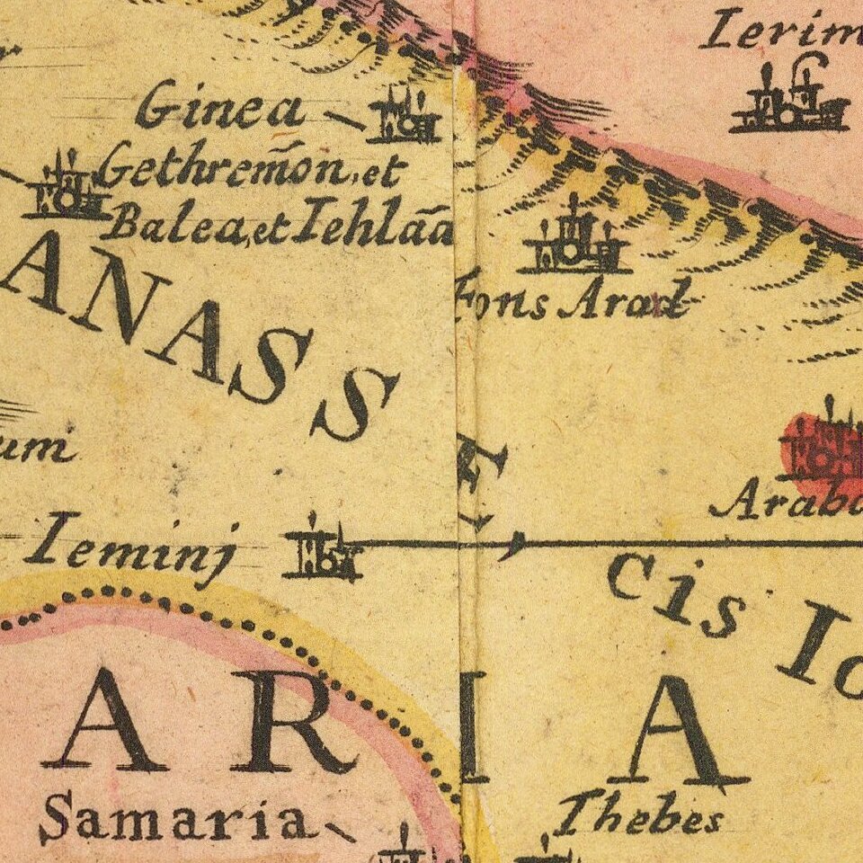 Decorated with two fine cartouches. The title cartouche includes four figures; at top Moses and Aaron flank the royal coat of arms, and at bottom, a Roman soldier and a pagan figure appear on either side of the Ark of the Covenant. The lower mileage-scale cartouche features Adam and Eve in the Garden of Eden.