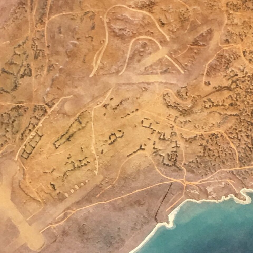 The model prominently features the three Japanese airfields on the island, as well as Mount Sirabachi, where Joel Rosenthal took one of the most famous photos of the War, of the raising of the flat by six Marines.
