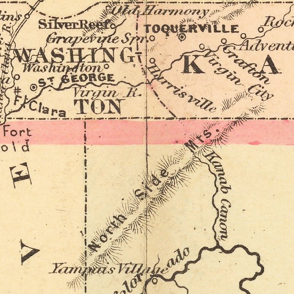 Nevada has its lower corner truncated, leaving Las Vegas in Arizona. Utah extends approximately 1 degree too far to the west, prior to the last set of reductions undertaken by the US Government. Several counties still extend into both Arizona and New Mexico. In each of the states and territories, the county configurations are still largely incomplete.