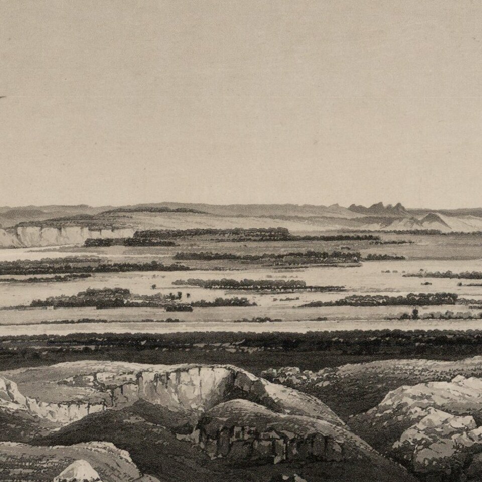 Finely executed view of the Junction of the Missouri and Yellowstone Rivers, from Maximilian, Prince of Wied's Travels in the Interior of North America, during the years 1832-1834, including blindstamp.