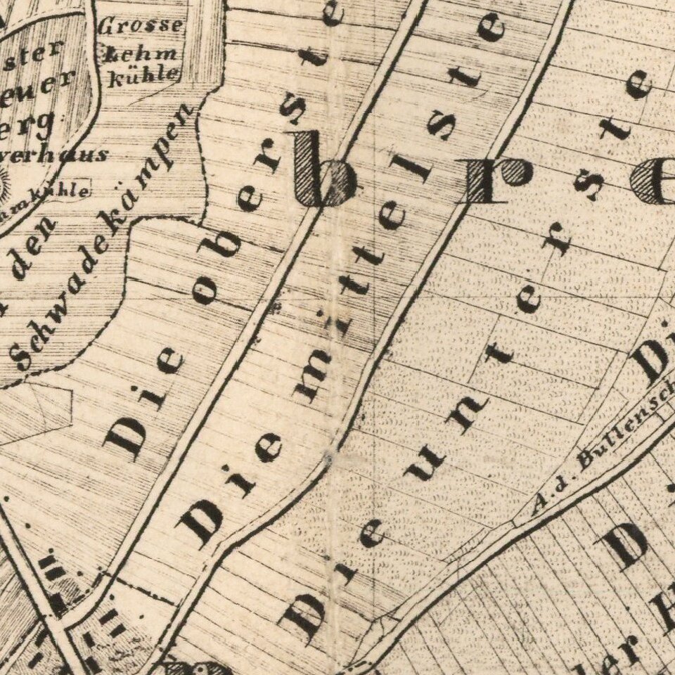 Thatjenjorst and Eberhard Klüver undertook a detailed cadastral survey of Bremen from 1826 to 1850 to further the Hanseatic City's land tax collection and for future city planning. Together with the Lieutenant A. Duntze he published in 1851 this map of the territory of the free Hanseatic city of Bremen.