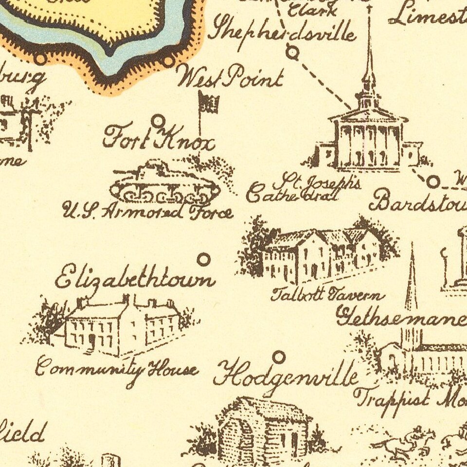 Rare pictorial map of the Kentucky, one of a number of different pictorial maps of Kentucky by the prolific illustrator Karl Smith.