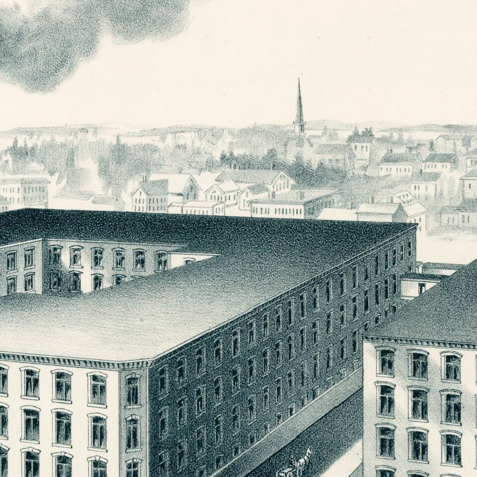 Rare view of the Knowles Loom Works in Worcester, Massachusetts, with the town and rail road line in the background.
