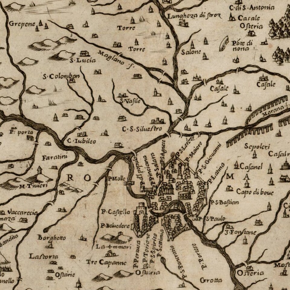 Duchetti's map of the area around Rome is based upon the map of Euphrosynus Ulpius. Duchetti's first edition was issued in 1564, with later edition issued by Henrik Van Schoel (1601) and Johannes Orlandi (1602).