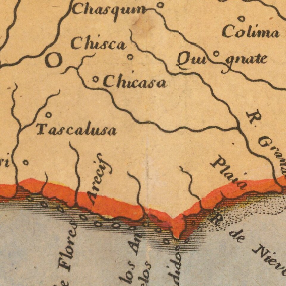 The projection of the Southeast is improved over Sanson's folio map of the prior year. The Florida nomenclature is corrected from Sanson's North America map. Most of the rest of the map is Chaves/Ortelius nomenclature. The Southwest is still largely unknown.