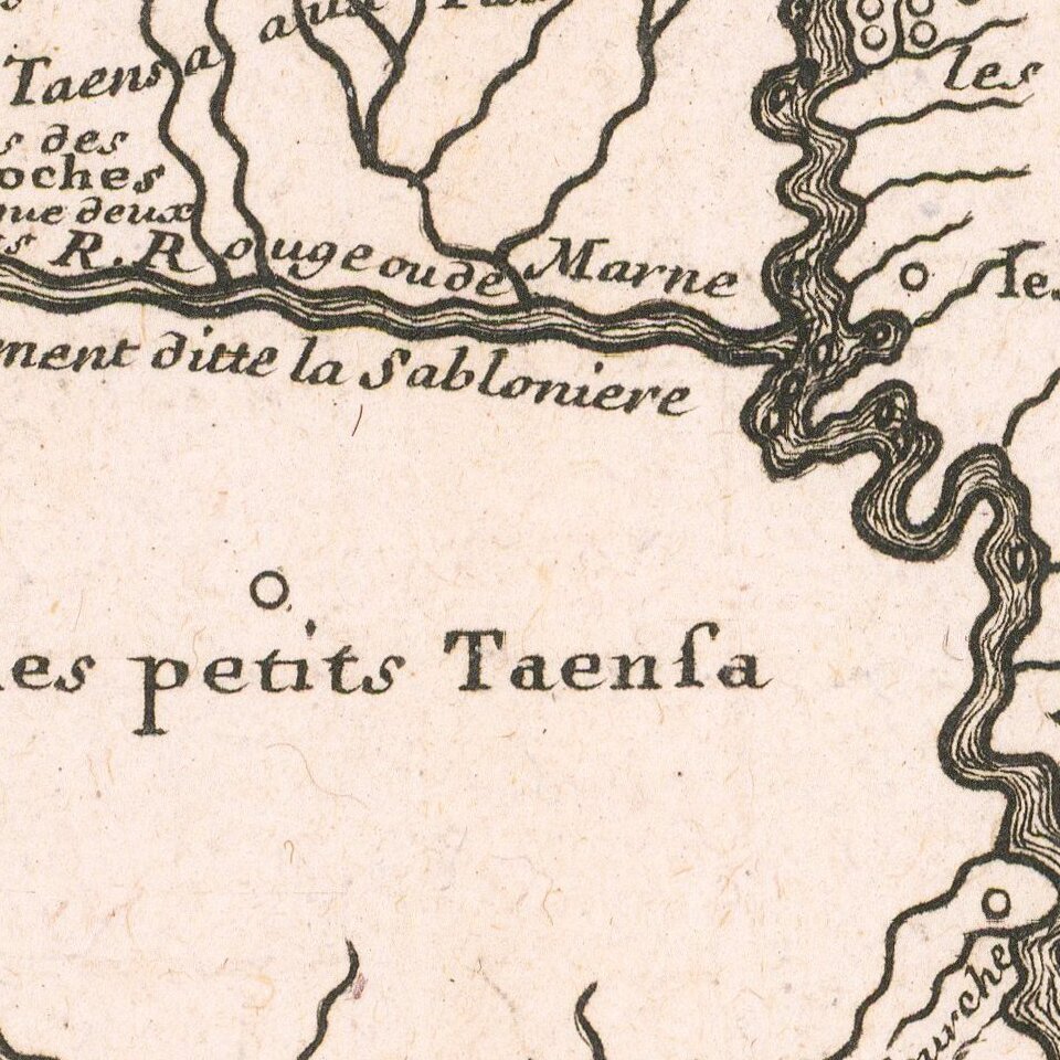 A close study of the 1715 De Fer and the 1718 De L'Isle show that the maps are not drawn from identical sources and that De L'Isle relied upon information drawn from Jean Baptiste le Moyne de Bienville, who left the Mobile area in 1713 and moved west, establishing Fort Rosalie (Natchez) in 1716 and later founding New Orleans in 1717, providing significant information to France which would not have been available to De Fer, most notably "Misions de los Teijas etablie en 1716." While De Fer gives notice of Beineville's presence on the other side of the Red River (Bienville de Taensa aux Yataches), De Fer's map would likely only have notice of Bienville's activities in 1713 and perhaps 1714.
