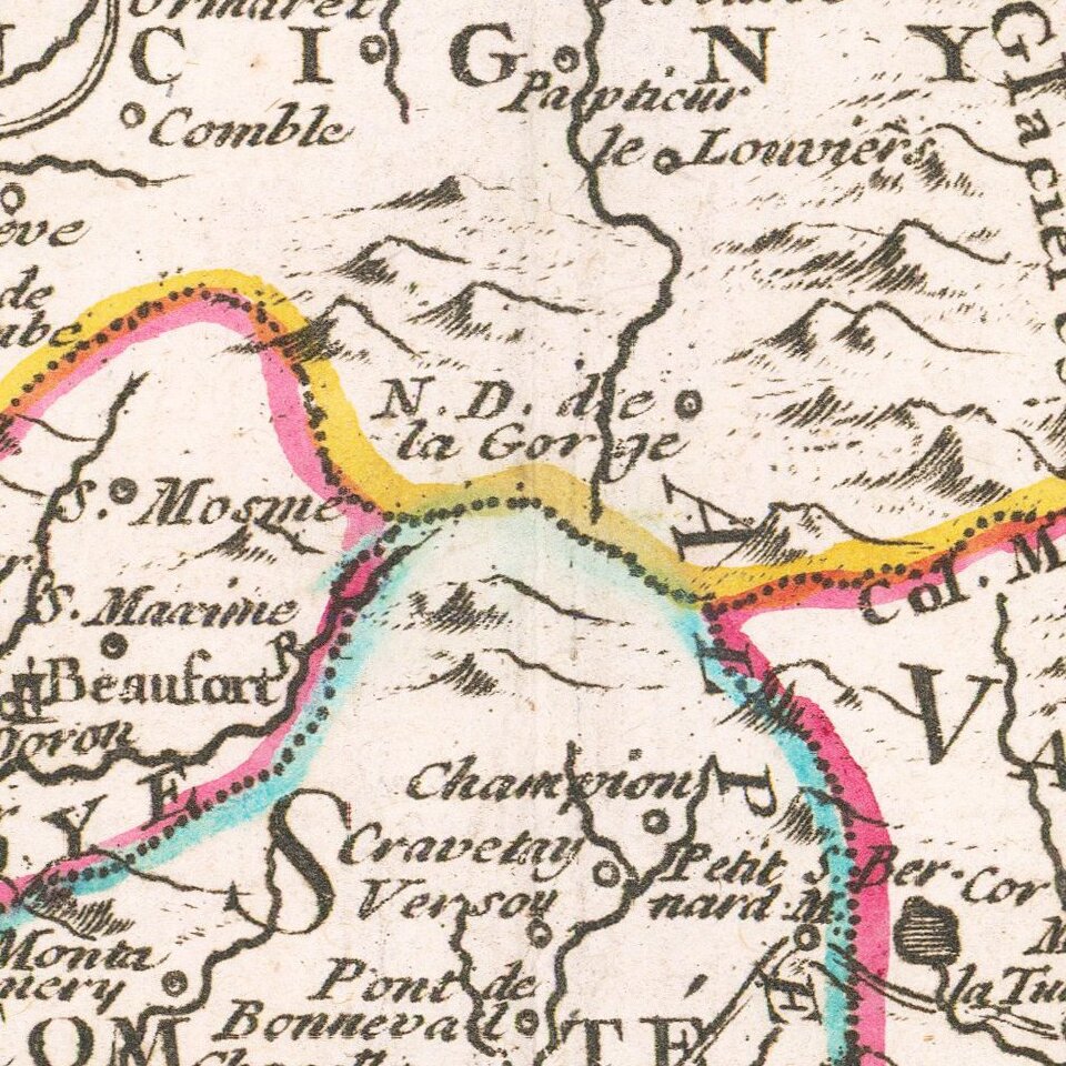 Detailed map showing the Savoy region of Italy and Switzerland.