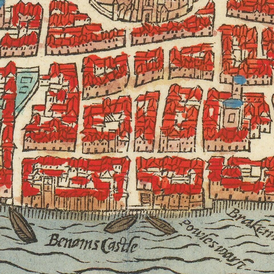 The map is drawn based on the view of London which appeared in Braun & Hogenberg's Civitates Orbis Terrarum, first issued in 1572. Braun & Hogenberg, in turn, based their view on a now-lost twenty-sheet plan of London believed to have been made between 1547 and 1559.