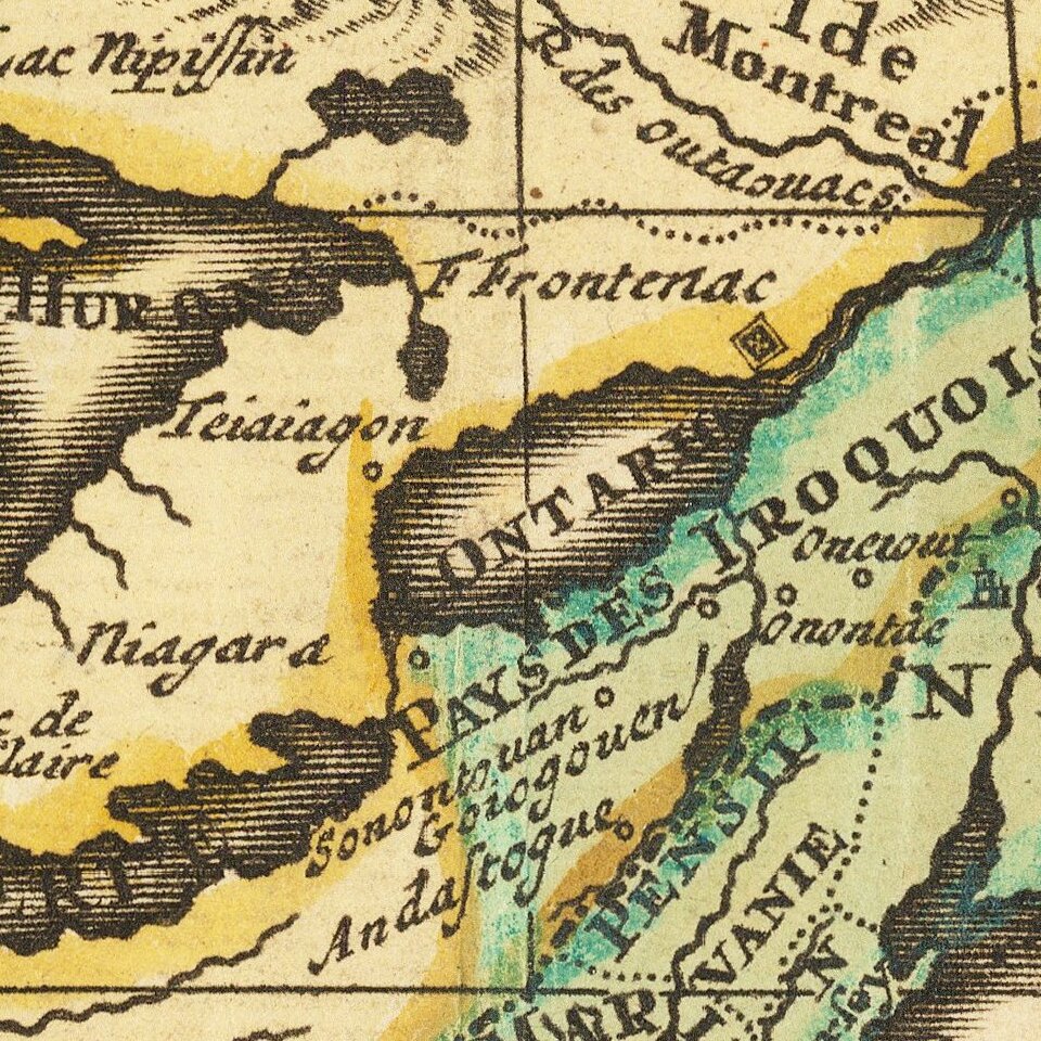 The Great Lakes, based on Coronelli, show the French strongholds at Tadousac, Quebec, Fort Sorel, Montreal, and Fort Frontenac. The English settlements are kept to the east of the Alleghenies, with Fort and River Kinibeki as the border between New England and Acadia.