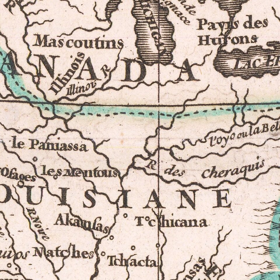 The map shows both the Bay of the West and River connecting Hudson's Bay and the Pacific, as well as a second River of the West (Lahontan's River), which shows connecting Lake Superior to the Pacific, via the Lake of the Woods. The Great Lakes are misconfigured. Nice treatment on the interior of North America, with many Indian place names.