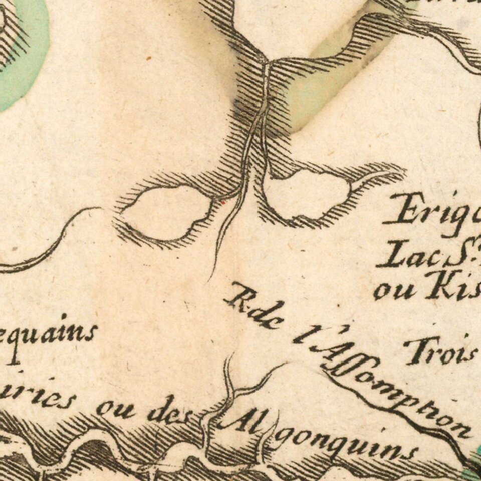 Du Val's Le Canada faict par le Sr. de Champlain . . . is unquestionably one of the most fascinating maps of the New World published in the 17th Century. Until 1953, it was believed that the map had been engraved by Du Val, to show the discoveries of Champlain in the first part of the 17th Century. However, in 1953, an untitled map of New France was acquired by the John Carter Brown Library, which upon close inspection was determined to be an unfinished proof state of Du Val's map, which had been engraved for Samuel de Champlain himself in 1616. The inscription, "faict par le Sr. de Champlain. 1616" which is present on the proof state and evident on later states engraved by Du Val, corresponds with Champlain's return to Paris in September 1616. Burden reports that the engraving work was done by the house of Melchior Tavernier and was likely intended to be included in Champlain's Voyage et descouvertures faites en Nouvelle France, published in Paris in 1619. As further noted by Burden, the map shows: