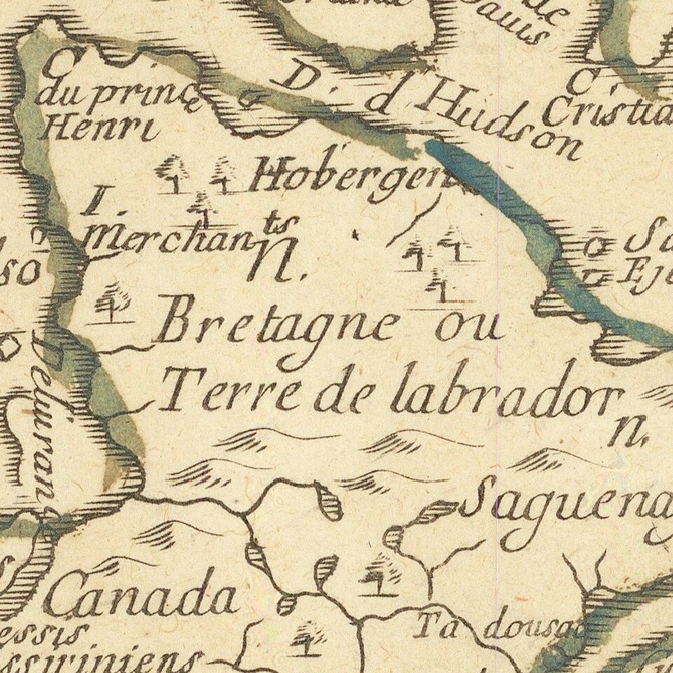 The map contains interesting morphological features as well as place names. A series of rivers and lakes effectively connect the Gulf of St. Lawrence to the Hudson Bay. The Hudson Bay itself is not well-formed, despite Foxe's exploratory journey being made three decades prior. The Severn River flows into a deep and narrow offshoot of the Hudson Bay entitled "Buttons B." New Denmark is visible in the westernmost reaches of the "Christian Sea" (in reality still the Hudson Bay). Lac Superieur and Lac des Puants open to the west, and many Indian tribes are named in the eastern area around the Great Lakes.