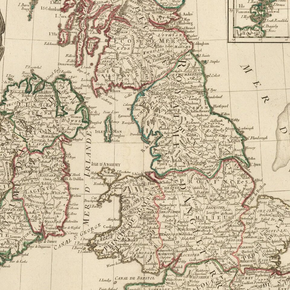 Decorative Italian map of the British Isles, published by Santini in Venice and engraved by Remondini.