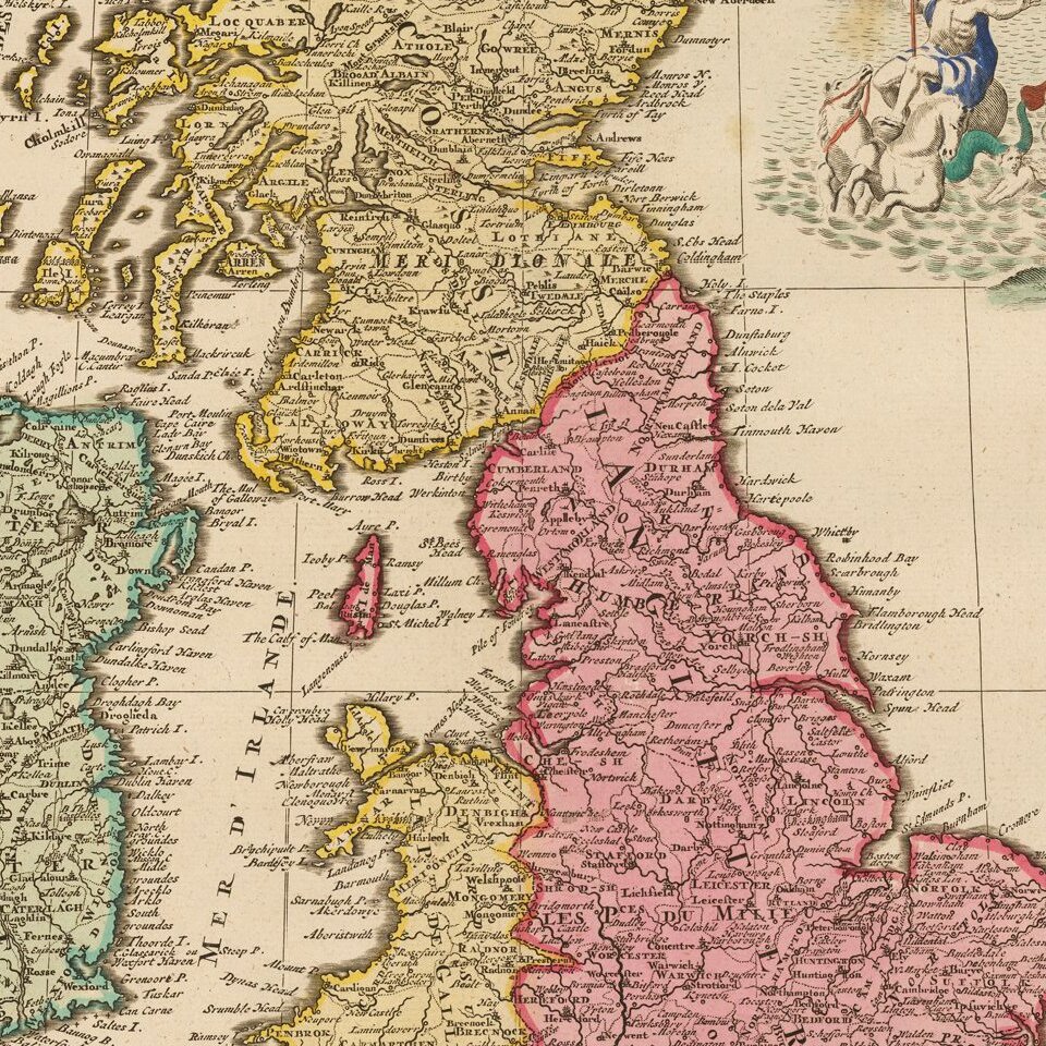 Scarce map of the British Isles, embellished with a large cartouche and coat of arms.