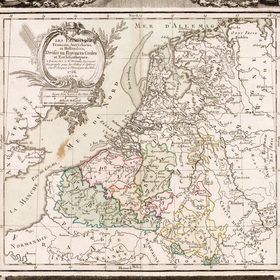 Decorative map of the Low Countries, with title cartouche and ornate picture frame border surrounding the map. Shows countries, cities, rivers, lakes, islands, etc.